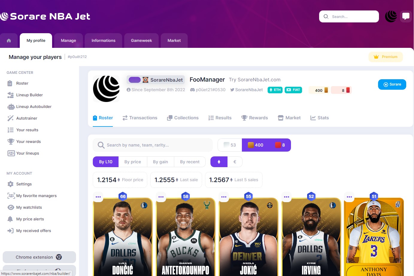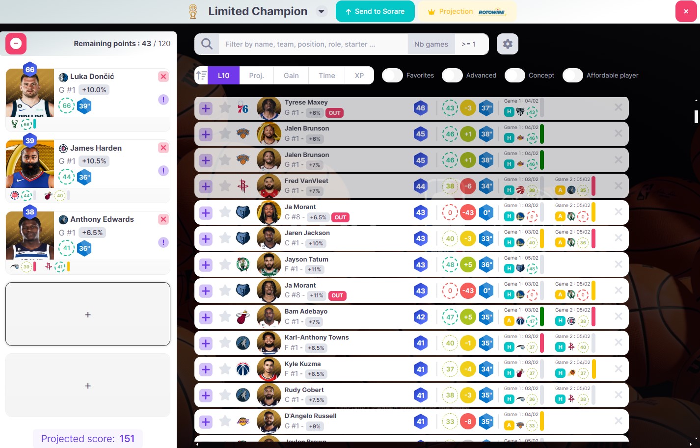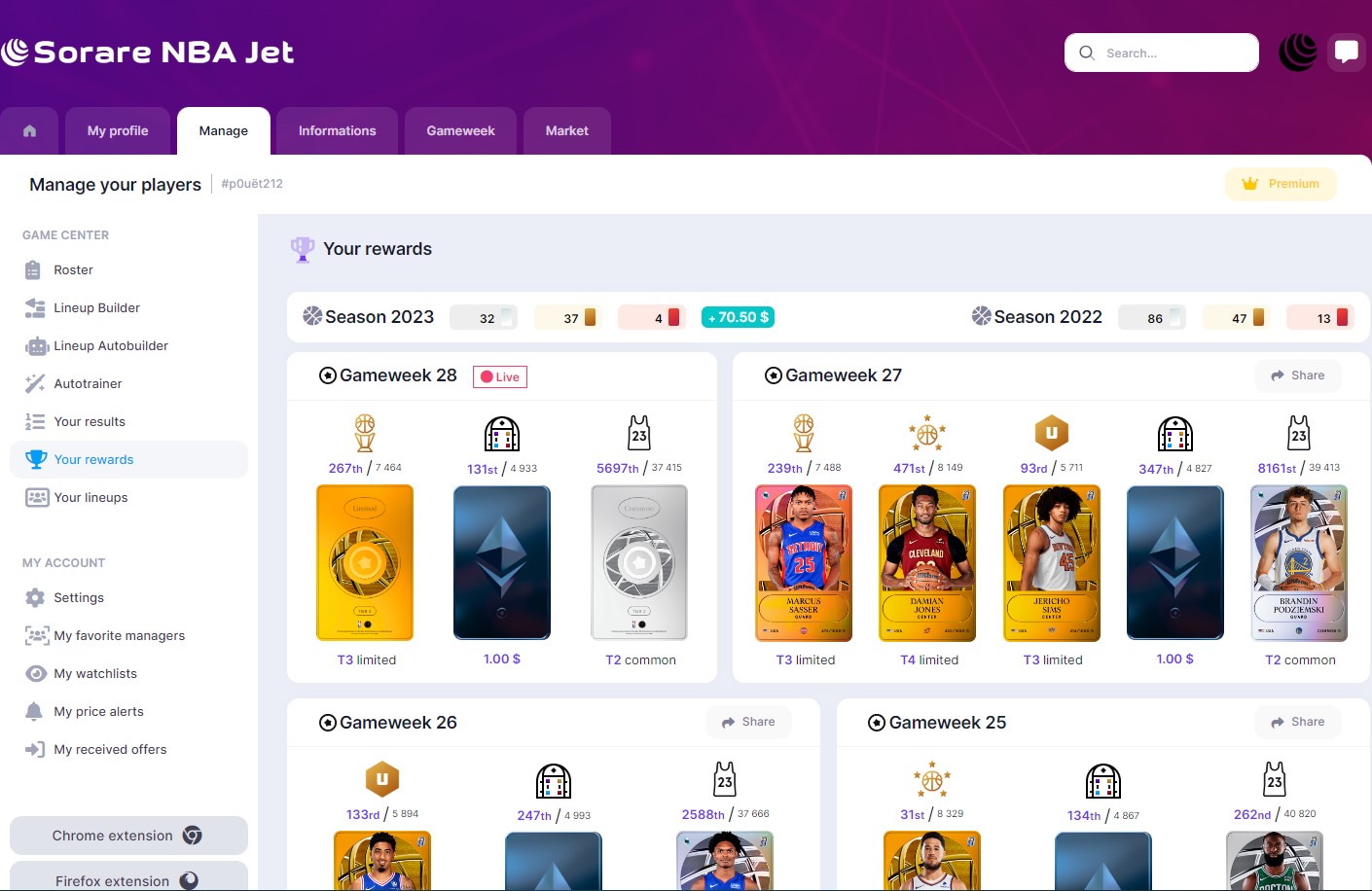 To access SorareNbaJet you must authorize the platform to access your account. Security is ensured by Sorare APIs. No transfer of cards or offers can be carried out from the platform.